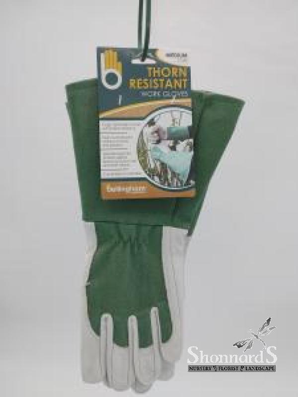 Thorn resistant work/garden glove for men & women. This glove features a canvas gauntlet to protect your forearms and a reinforced cowhide palm that resists punctures and abrasion.
