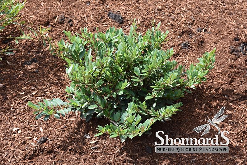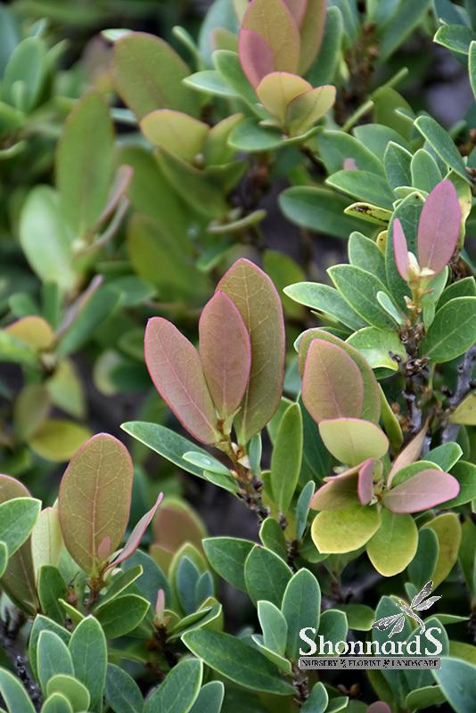 An attractive evergreen plant with emerging coppery-red new foliage that matures to a matte finish blue-green; in late Winter to early Spring, red flowers emerge along the older branches; very elegant when massed together or as an accent shrub