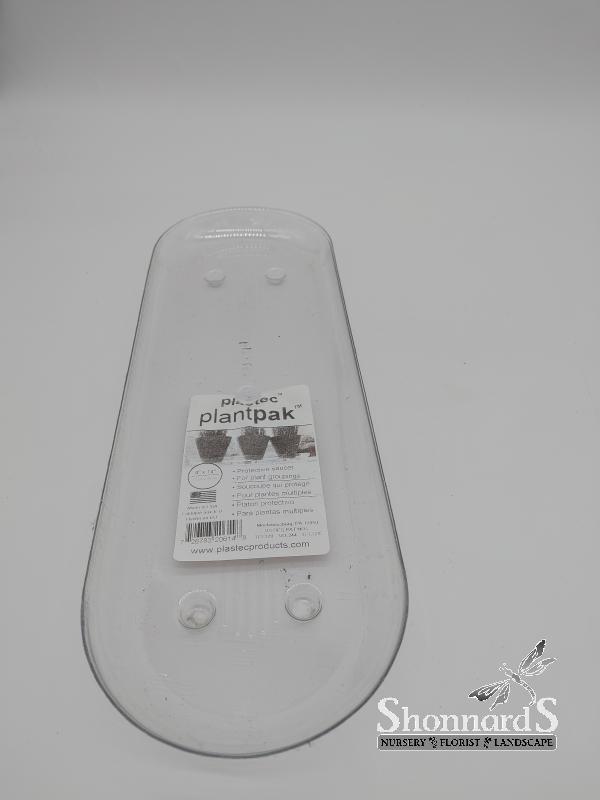 Designer saucer that holds two or three plants placed side by side. The crystal clear recyclable PET saucer has supportive feet to maintain air circulation underneath preventing condensation from damaging surfaces. Made in USA.