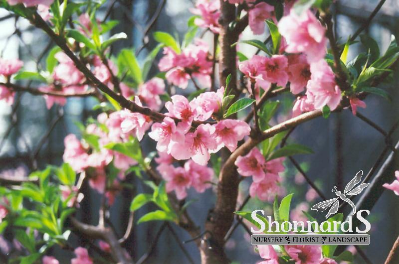 A dwarf selection which produces flavorful red over yellow freestone fruit in summer; highly ornamental, with hot pink flowers in spring and a low, compact habit; susceptible to late spring freezes and disease, needs full sun and well-drained soil.