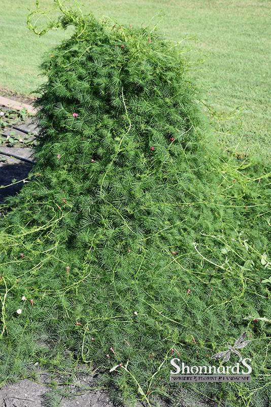 Cypress Vine features dainty scarlet trumpet-shaped flowers along the stems from early summer to mid fall. Its attractive glossy threadlike pinnately compound leaves remain green in color throughout the season.