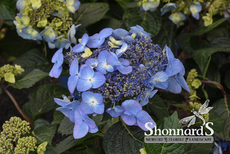 A compact hydrangea that blooms on old and new wood, giving a long season of color; rounded lacecap flowers are electric blue in acidic soil, or shades of pink in neutral or alkaline soils; perfect for shrub borders or containers.