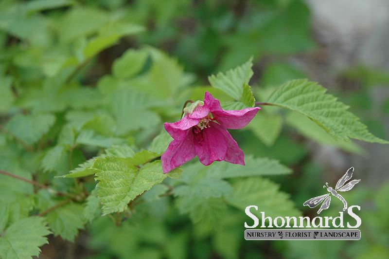 Salmonberry has fragrant hot pink flowers with white centers at the ends of the branches from late spring to early summer. It has bluish-green deciduous foliage. The crinkled pointy compound leaves turn yellow in fall.