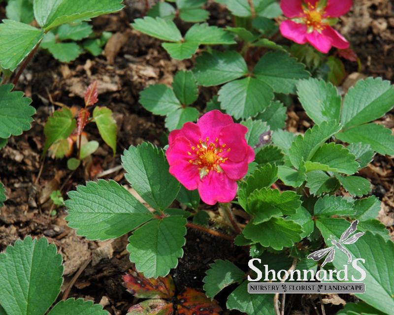 An ornamental strawberry perfect for containers, hanging baskets, window boxes or used as groundcover; bright cherry-red flowers are nestled on top of mounded green foliage; tasty, small bright red strawberries make an appearance during the summer months.