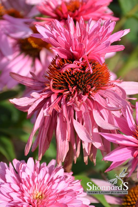 Double Decker Coneflower has masses of beautiful lightly-scented rose daisy flowers with coppery-bronze eyes at the ends of the stems from mid summer to mid fall, which are most effective when planted in groupings. The flowers are excellent for cutting. Its pointy leaves remain green in color throughout the season. The fruit is not ornamentally significant.