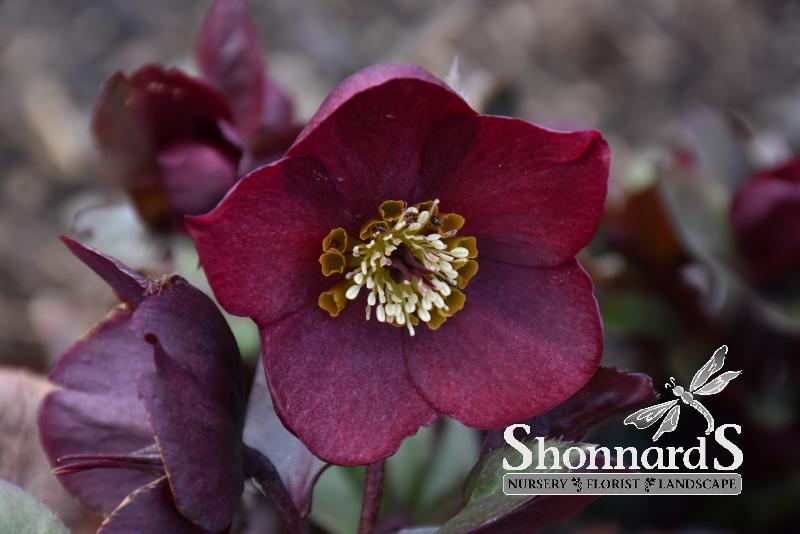 Honeymoon® Rome In Red Hellebore features showy nodding dark red cup-shaped flowers with burgundy overtones and black streaks at the ends of the stems from late winter to early spring. The flowers are excellent for cutting. Its attractive serrated oval compound leaves remain dark green in color throughout the year.