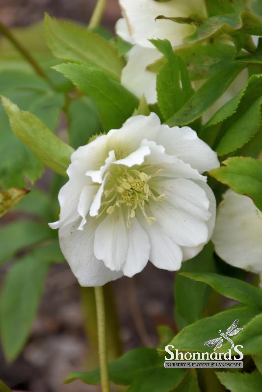Wedding Party® Wedding Bells Hellebore features showy nodding double white cup-shaped flowers with chartreuse eyes and buttery yellow anthers at the ends of the stems from late winter to early spring. Its glossy oval compound leaves remain bluish-green in color throughout the year.