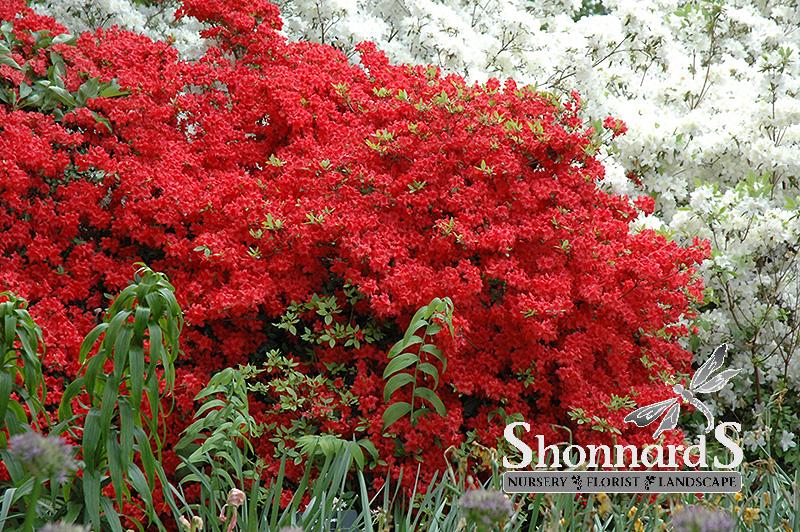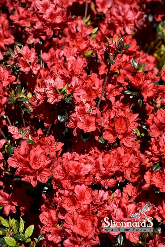 Abundant orange-red flowers completely cover this evergreen azalea in mid-spring.  Dark and glossy foliage keeps it attractive throughout the year.  Azaleas perform best in partial shade and acidic soils, and benefit from regular watering and occasional pruning and feeding.