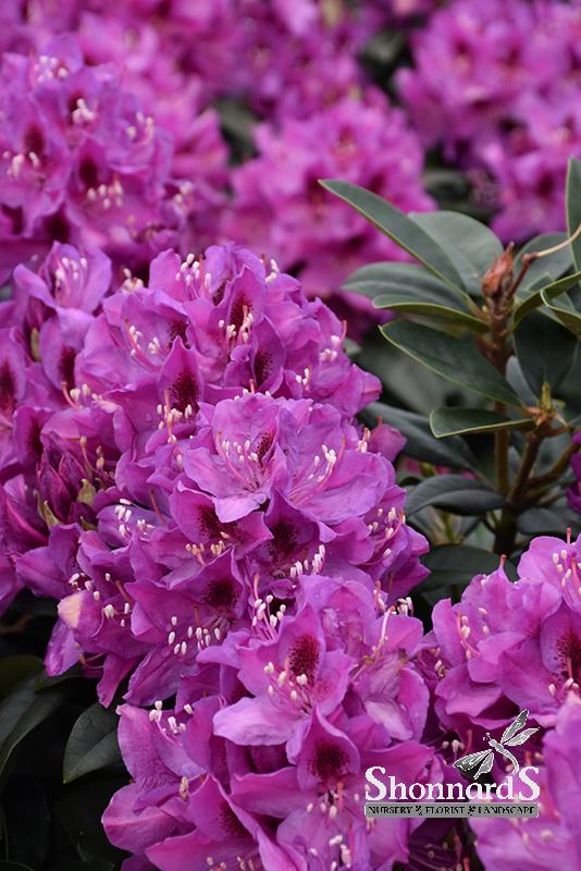 Full trusses of lovely reddish-purple flowers in late May and early June with sturdy dark green leaves retained all year; this variety copes well with sun and heat; it is vigorous and upright, ideal for a shrub border; must have acidic and organic soil: