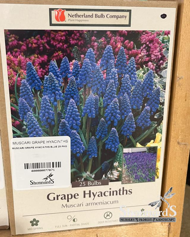 Grape Hyacinth has masses of beautiful spikes of blue bell-shaped flowers rising above the foliage in mid spring, which are most effective when planted in groupings. Its grassy leaves remain green in color throughout the season.
