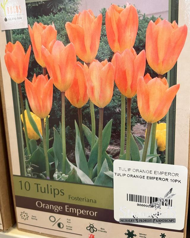 The Tulip Orange Emperor is a striking addition to any garden, celebrated for its vibrant orange blooms that bring a warm glow to spring landscapes. This variety features sturdy stems and large, cup-shaped flowers that can reach up to 5 inches in diameter, making them a standout choice for borders, containers, and cutting gardens.