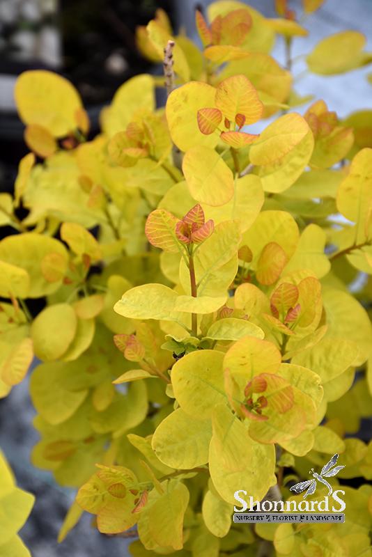 Winecraft Gold® Smokebush has attractive light green-variegated chartreuse foliage with hints of gold which emerges orange in spring on a plant with an upright spreading habit of growth. The round leaves are highly ornamental and turn an outstanding yellow in the fall. It features airy plumes of light green flowers at the ends of the branches from early to late summer.