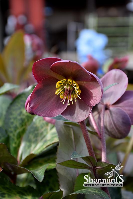 Pippa's Purple Hellebore features showy nodding purple cup-shaped flowers with red overtones at the ends of the stems from late winter to early spring, which emerge from distinctive pink flower buds. Its glossy oval compound leaves emerge coppery-bronze in spring, turning bluish-green in color with distinctive light green veins the rest of the year. The dark red stems can be quite attractive.