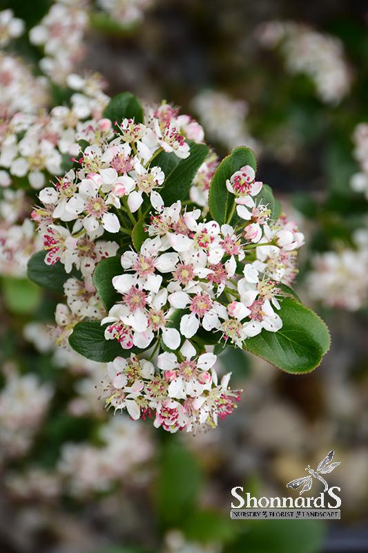 A compact, low mounded variety with glossy dark green leaves, and showy white flowers in spring; a great choice for edging and groundcover; brilliant red foliage in fall to contrast the dark purple-black fruit; very adaptable