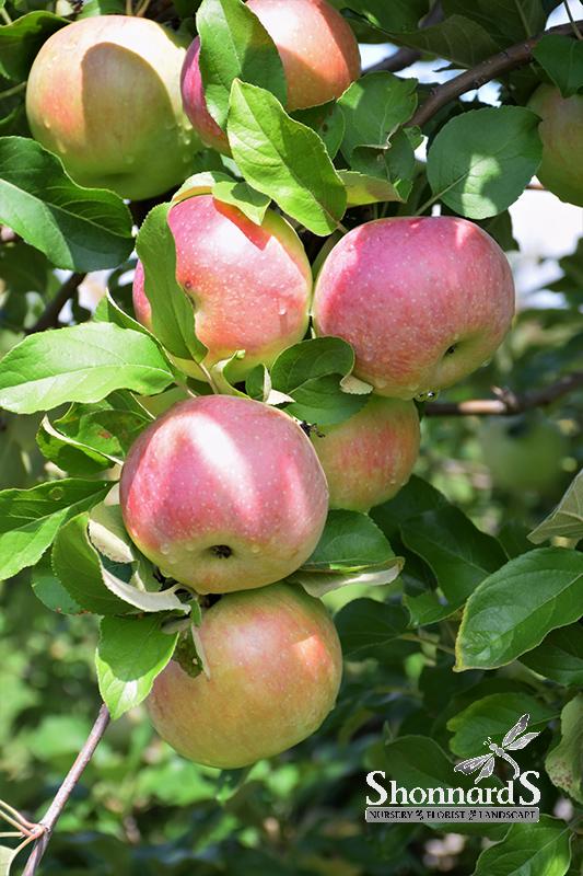 A vigorous tree with large, thin skinned, greenish-yellow fruit that is flushed and striped red; yellow to white flesh is crisp, juicy, and slightly sweet; stores well; ideal for home landscapes, needs well-drained soil and full sun