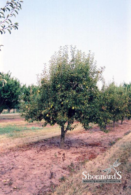 The most commercially popular pear, produces excellent quality yellow-green fruit in early fall; very showy white flowers in spring and an upright oval habit, very ornamental; needs a pollinator, fallen fruit can be messy, can be susceptible to fireblight.