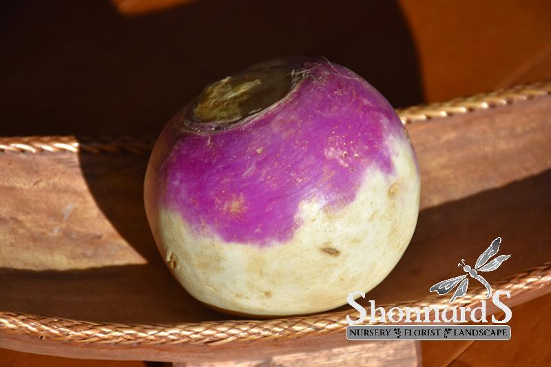 The Purple Top White Globe turnip features a striking purple crown that transitions to a smooth white base, creating an appealing visual contrast. These turnips are known for their uniform round shape and tender texture, making them ideal for a variety of dishes, from hearty stews to fresh salads.