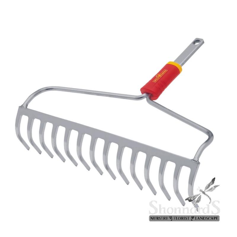 The solid steel Wolf Garten Bow Rake, with a working width of 16" is eminently suitable for raking, fine crumbling and leveling seed beds. The tines of the soil rake have an enhanced curve to easily strip out rocks or clay with either a pull or push motion. This steel garden rake is also best used for gathering or spreading dirt, rocks, mulch or gravel.