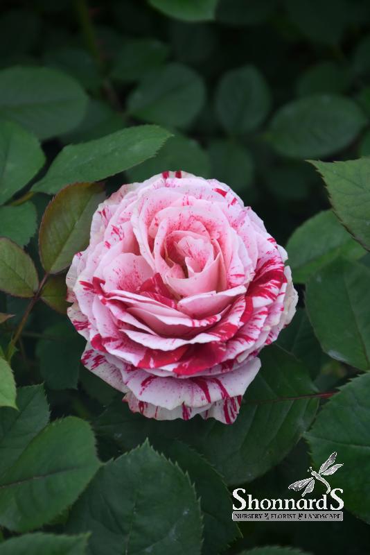 When you see this rose, you want it - the spicy fragrant flowers have bright cherry red flowers prominently streaked in white, simply calling out to be seen, a genuinely tough rose; all roses need full sun and well-drained soil.