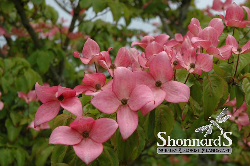 Scarlet Fire® Flowering Dogwood is smothered in stunning clusters of rose flowers with pink overtones and scarlet edges held atop the branches from mid spring to early summer. It has attractive green foliage with rose veins. The glossy pointy leaves are highly ornamental and turn an outstanding red in the fall. It produces pink berries with red hints from early to mid fall.