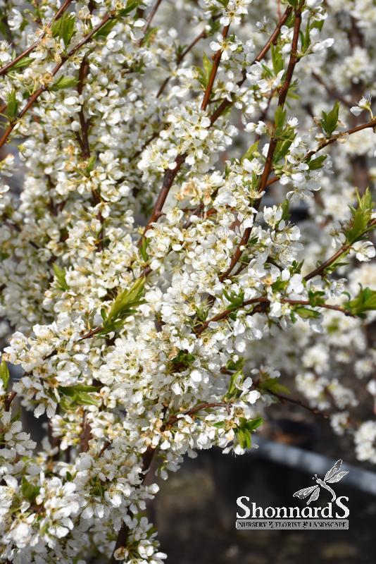 An inter-species, plum-apricot hybrid with showy fragrant white flowers in spring and sweet, deep red fruit in mid to late summer. The fruits have a sweet taste with a crisp texture and a spicy fragrance. Great for eating fresh and preserves; semi-clinging stone; must have a Japanese plum variety or hybrid as pollinator.