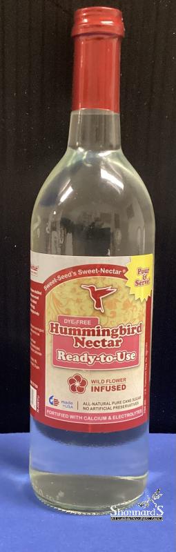 Our Sweet-Nectar™ ready-to-use hummingbird nectar is infused with all-natural, steam-distilled wildflower hydrosols that your hummers will love. Added calcium promotes healthy egg development and electrolytes aid in the prevention of dehydration. No unnecessary food coloring or corn syrup here! Just pour straight from the bottle into any hummingbird feeder and enjoy!