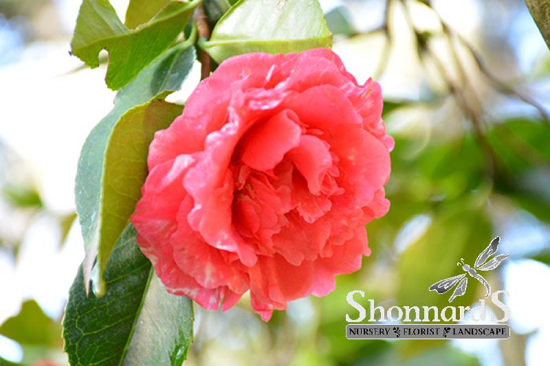 Daikagura Camellia features showy fully double rose round flowers with white spots at the ends of the branches from late fall to early winter. It has dark green evergreen foliage.