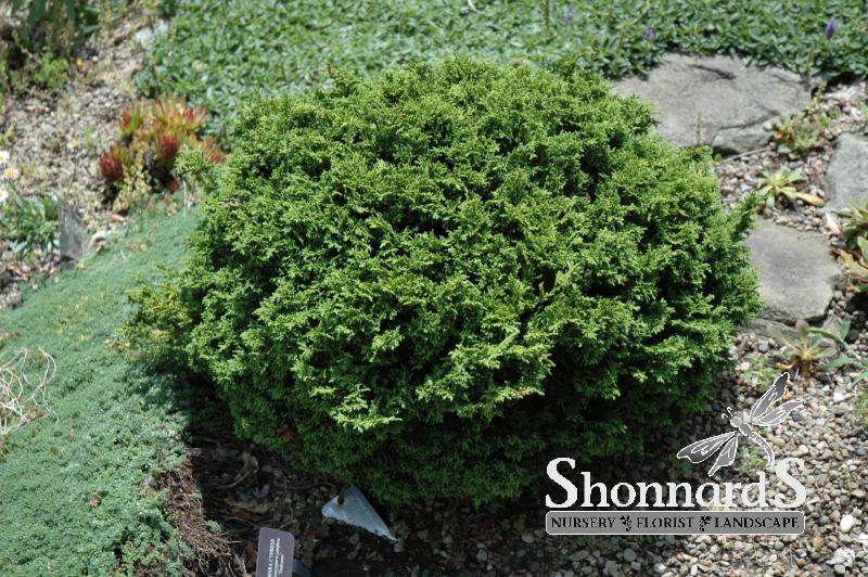 A variety of threadleaf falsecypress with fine, almost string-like deep green foliage, giving a fine texture; ideal for texture contrast in the garden; grows very slowly in a compact flat topped shrub.