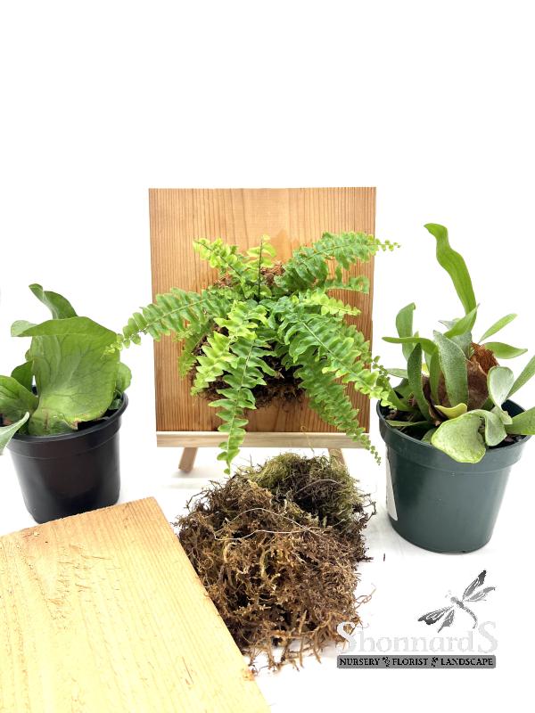 $35 class fee includes wood, mounting materials, 1 fern of your choosing, and instruction.
